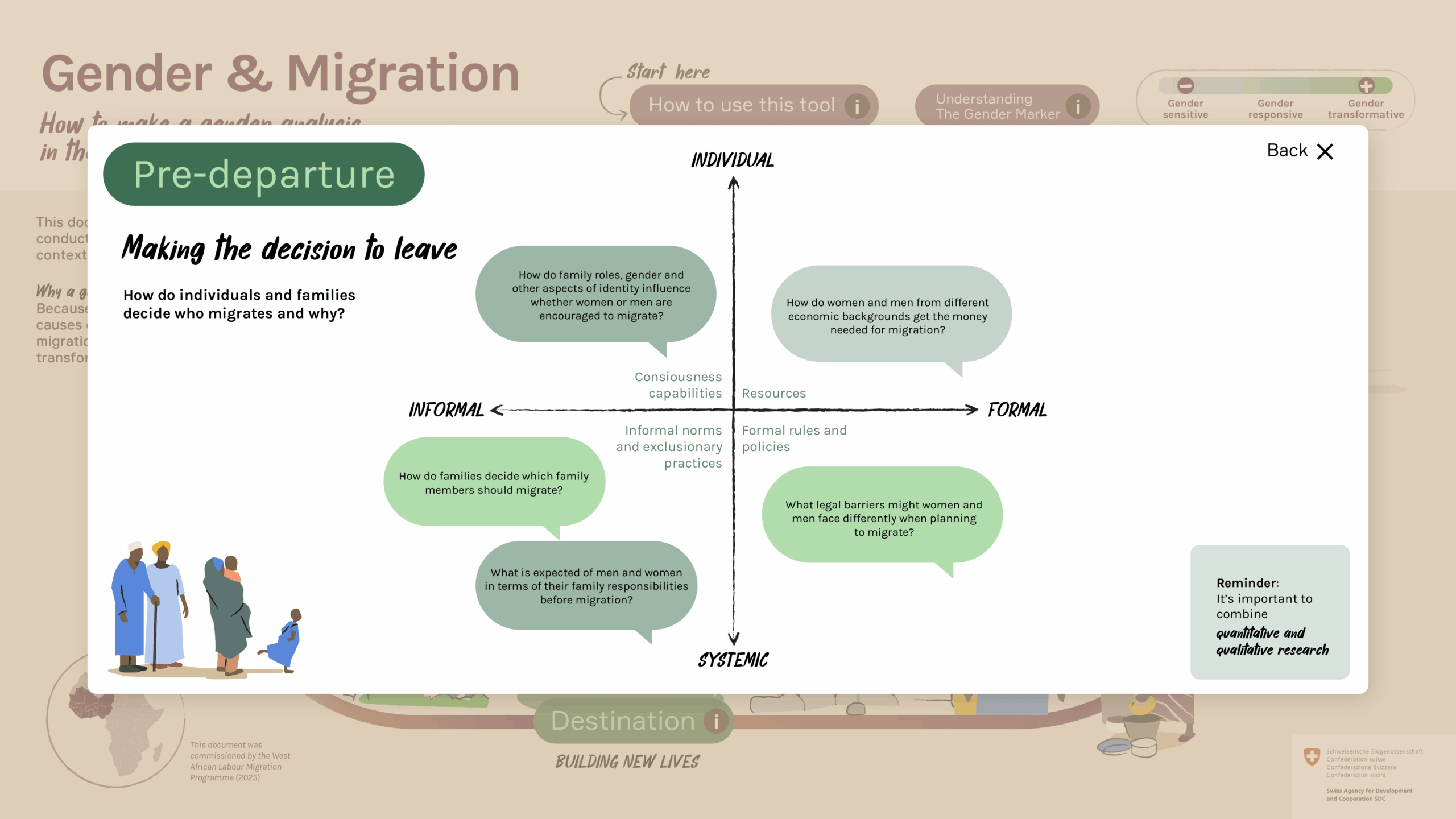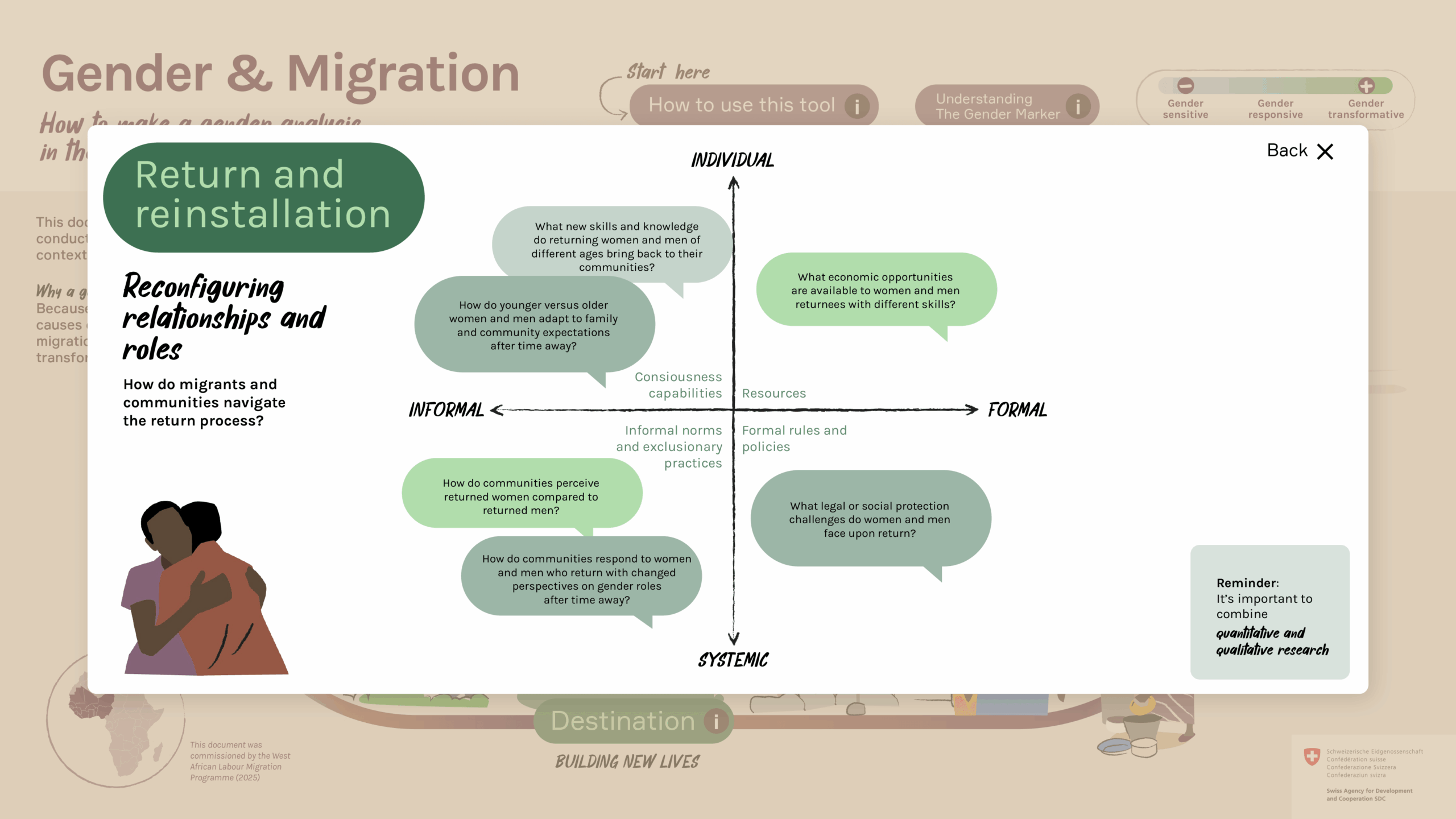 To create visual tools that support both gender analysis in migration contexts and gender-responsive project implementation, enabling consistent, informed decision-making throughout the programme cycle.